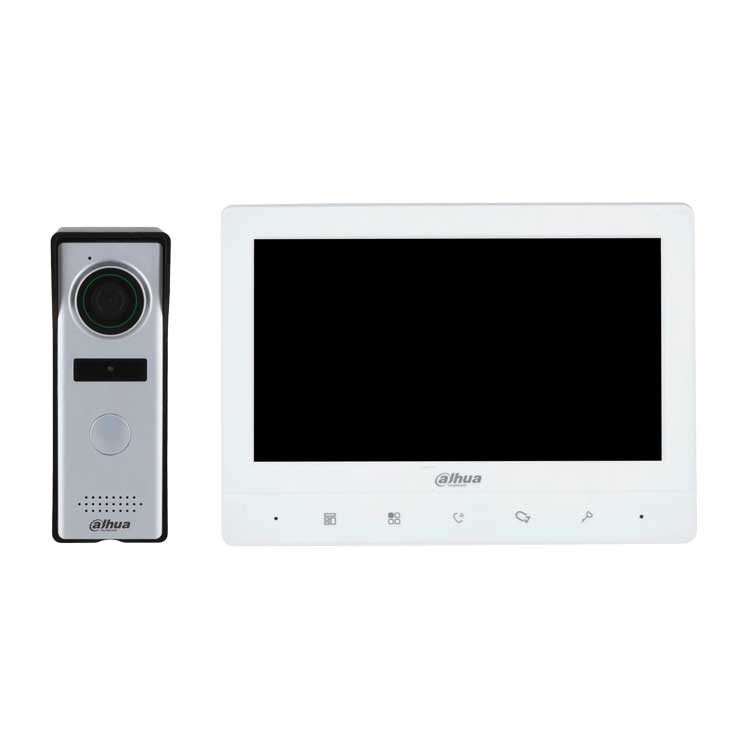 DHI-VTH1020J-T+DHI-VTO1000J DHI-VTH1020J-T 7-дюймовый TFT-экран, сенсорный, 1024×600; 4-х проводная связь, функция видеодомофона: разблокировка, голосовой вызов, видеозвонок, регулировка громкости; Поддержка 2 вызывных панелей + 3 внутренних мониторов, несколько звуков звонка; поддержка цифрового широкого динамического диапазона (DWDR), DC12V/2A, 134х183х18 мм; DHI-VTO1000J - Вызывная видеопанель, накладная, 4-х проводная, CMOS-матрица 1,3 МП, угол обзора 70°, IP66, -30...+60°C, 132х46х34 мм,