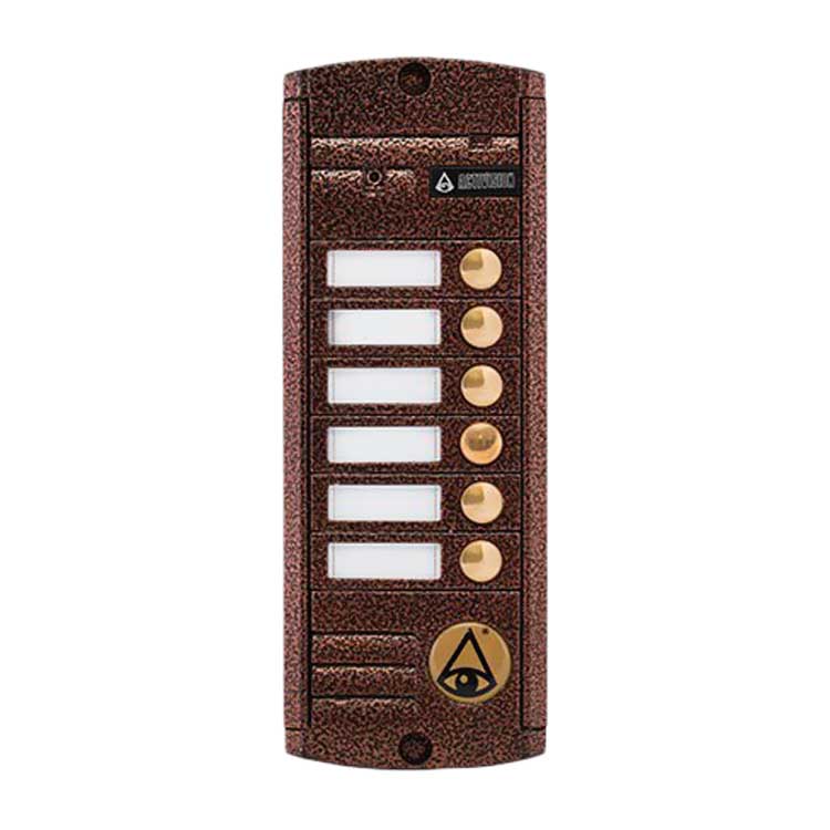 4-х проводная; антивандальная накладная видеопанель 6-ти абонентная; с ИК подветкой до 0,6м, матрица CCD SONY, 1/3", 420 ТВл, 12В, угол обзора 75 (гор.) 55 (верт.); рабочий диапазон t -50…+50; 185х70х20 мм, Цветовая гамма: медь, антик