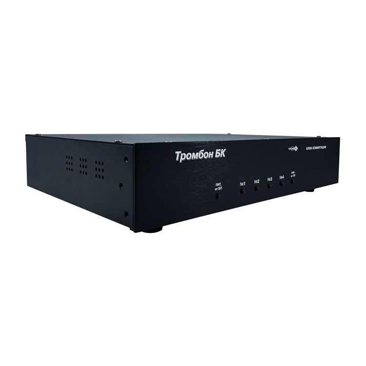 Блок коммутации Тромбон БК предназначен для коммутации питающего напряжения ~220В 50 Гц на 4 усилителях мощности Тромбон – УМ. Прибор соответствует техническим условиям ТУ 4371-001-88310620-08 и нормативным документам: Своду правил 3.13130.2009 и ГОСТ Р 53325-2012.