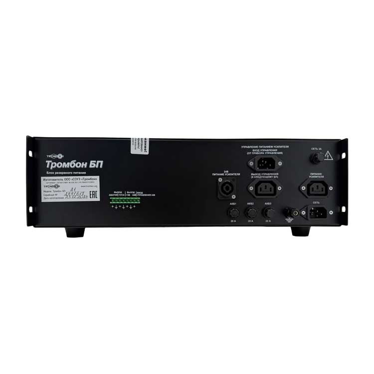 Блоки резервного питания и коммутации Тромбон БП-21 предназначен для обеспечения резервным низковольтным электропитанием (коммутируемое 24-28В/40А, постоянное 24-28В/2А и постоянное 12В/2А) усилителей мощности и других технических средств, входящих в состав системы оповещения и управления эвакуацией. Блоки также могут быть использованы для питания системы эвакуационного освещения и управления дополнительными техническими средствами, такими как световые эвакуационные знаки безопасности, электромагнитные замки дверей эвакуационных выходов, звуковые излучатели, генераторы сирены и т.д. Поставляется с установленными АКБ 7А/ч 12В х 6шт. Может служить резервным источником питания для усилителей Тромбон УМ-120/Тромбон УМ-240/Тромбон УМ-360/Тромбон УМ-480/Тромбон УМ-600.