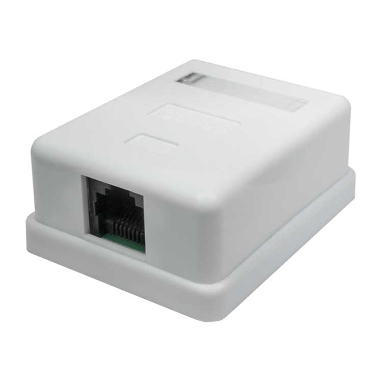 Неэкранированная компьютерная розетка настенного монтажа. Соответствует характеристикам категории 5е. Имеет 1 порт RJ-45 (8р8с).