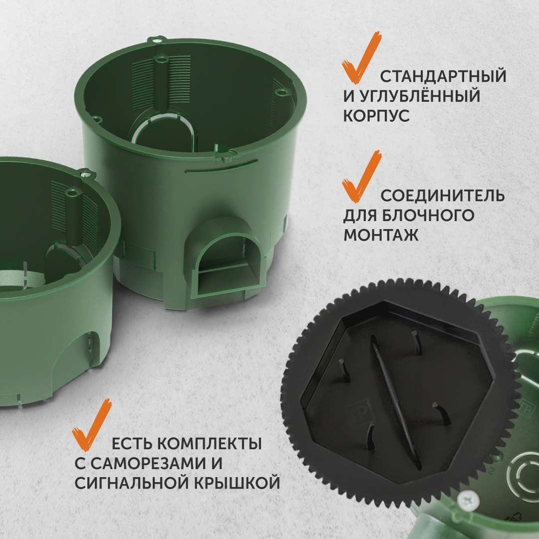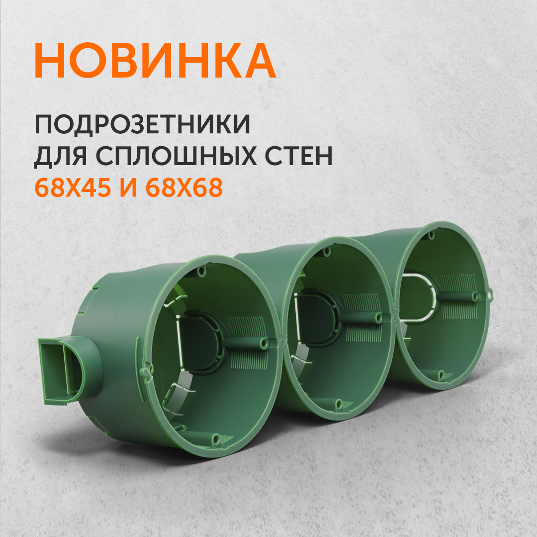 Есть стандартная и углубленная версия подрозетника 68х60 мм на случай, если требуется больше места для подключения. Коробки в исполнении «Стойкие к горению» подойдут для применения на объектах с повышенными требованиями к пожаробезопасности.