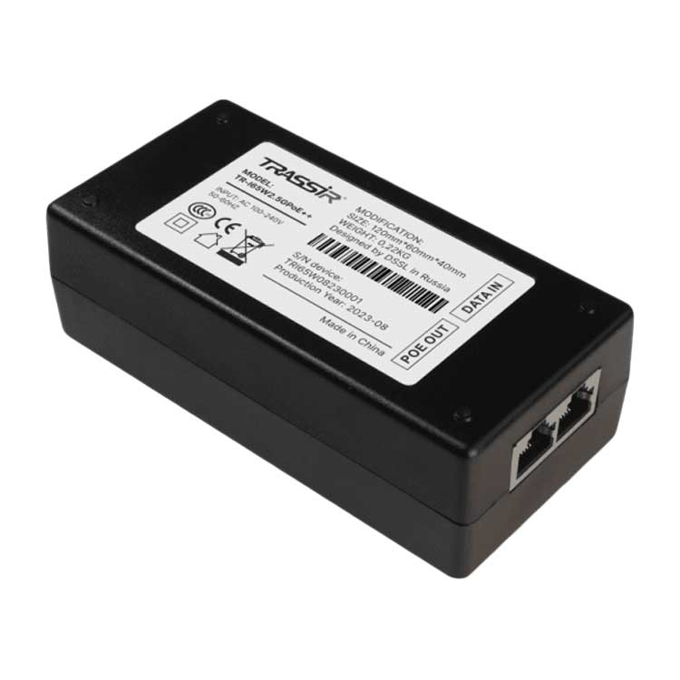 TR-I65W2.5GPoE++ POE-инжектор. Вход: 100-240В 50/60Гц . Мощность POE на порт 65Вт. Общий бюджет 65Вт. Порты: 1*RJ45*10/100/1000M Data IN, 1*RJ45*10/100/1000M PoE OUT. Предназначен для питания устройств по протоколам IEEE 802.3af/at/bt. Функция автоматического определения PoE устройств. Молниезащита. Размеры корпуса 120х40х60 (ШхВхГ).